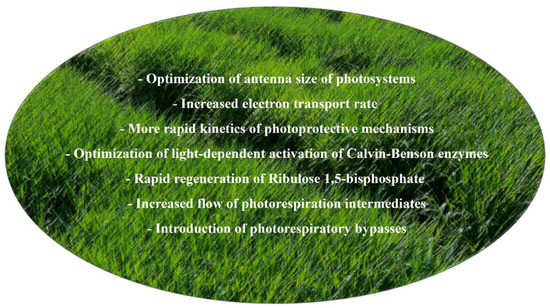 | 1. Increasing the abundance of different enzymes of the Calvin–Benson cycle | >30% | Increased accumulation of SBPase and FBPA enzymes by transgenic approaches. Identification of allelic variants by allele mining and TILLING. | Optimization of ribulose 1,5-bisphosphate (RuBP) regeneration. | [138,139,140,141,142] |