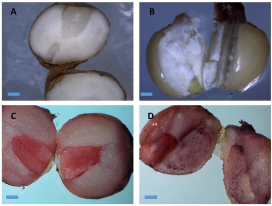 Stereo microscopic images of stained A. longiloba embryos by immersion in a tetrazolium solution. (A) Natural color of A. longiloba seed; (B) non-viable seed which retained its original color after TZ treatment; (C) and (D) red–pink color stained on the embryo after TZ treatment which indicates that the seed is viable (magnification: 40×; bar: 1 cm).