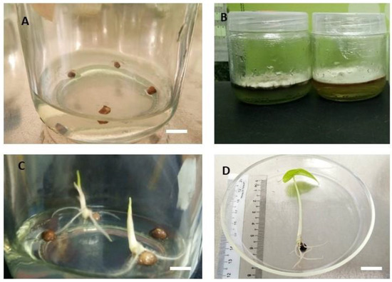 Seed culture of A. longiloba. (A) seed on the first day before contamination sets in; (B) contaminated culture; (C) germinated seed after 2–3 weeks of culture (bar = 1 cm); (D) four weeks old germinated seed explant (bar = 1 cm).