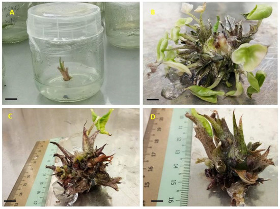 In vitro shoot multiplication from at different subculture stages. (A) Individual shoot used for shoot induction and multiplication; (B) and (C) maximum number of shoots per explant obtained with 3-mg L−1 BAP after four weeks; (D) highest shoot length obtained with 3-mg L−1 TDZ. Bar = 1 cm.