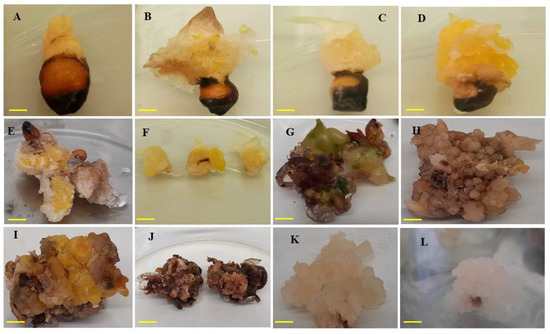 Callus formation on MS media fortified with IAA and PIC alone or in combination with BAP. (A) Compact callus induced with 1-mg L−1 IAA; (B) yellowish compact callus induced with 2-mg L−1 IAA; (C) and (D) yellowish friable callus induced with 3-mg L−1 IAA; (E) brownish-yellow callus friable texture induced with 3-mg L−1 PIC; (F) callus obtained from 3-mg L−1 IAA and further used for callus proliferation; (G–J) brown callus from second subculture using combination of IAA with BAP; (K–L) friable callus from second subculture. Bar = 1 cm.