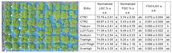 Plant dimension assessment on 08.10.18. Representative image of a drone picture (left) used for the determination of plant and flower quantification. Living ground cover (LGC), flower ground cover (FGC), and their ratio (right) resulting from the statistical analysis of numerical data obtained from the picture. The statistical analysis (software Statistica by StatSoft) was performed by means of one-way analysis of variance (one-way ANOVA) with Duncan Test (α) = 0.1. For each trait, at least one letter in common indicates no significant difference according to the Duncan test.