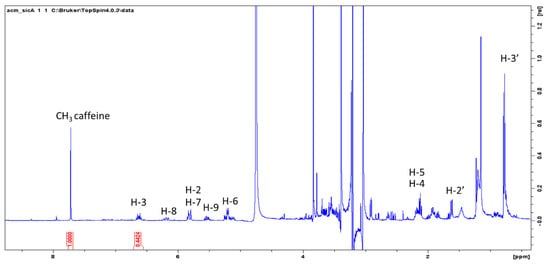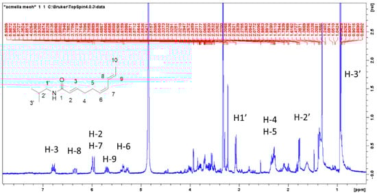 Preliminary investigation on the possibility to quantify spilanthol by 1H-NMR were performed using caffeine as internal standard as previously reported for other plant constituents [,,]. The extraction was performed weighing 100 mg of dried plant material, adding 1 mg of caffeine, and extracting in methanol in ultrasound bath for 10 min with 25 mL of methanol. Liquid was decanted and collected, a further 20 mL of methanol was added, and the mixture was sonicated for 10 min. Liquids were collected, dried under vacuum, and the residue dissolved with deuterated methanol. Alternatively, 100 mg of plant material can be directly extracted with methanol and internal standard (1–3 mg) and the mixture used for 1H-NMR determination using solvent suppression.