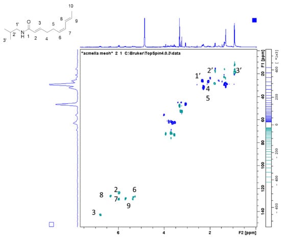 Spilanthol assignment in the HSQC-DEPT spectrum in extract obtained from reference plant material.