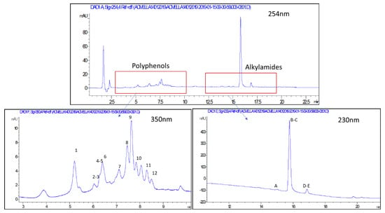 Chromatogram of A. oleracea extract at 254 nm and enlargements at 350 nm of polyphenol signals and at 230 nm of alkylamide signals.