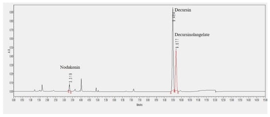 Each sample was labeled and then crushed, and 10 mg was extracted using 1 mL of 100% MeOH for one hour. Extracts were centrifuged for 20 min at 3000 rpm and filtered with a 0.2-μm membrane filter (Whatman PTFE Syringe Filter, UK) for analysis. The content analysis was conducted using decursin, decursinolangelate, and nodakenin, which are the indicator components of the Korean Angelica as standard substances purchased from the National Institute for Korean Medicine Development and had a purity of 97% or more. MeOH, acetonitrile, formic acid, and water, used in extraction and UPLC analysis, was purchased from J. T. Baker (USA) products, and formic acid used was from Sigma-Aldrich (USA) products. Analysis of the standard substances and extracts of samples were analyzed using the Waters Acuity I-class UPLC system (Waters, USA), and the HPLC conditions shown in the Korean Pharmaceuticals were modified to establish the optimal analysis method for UPLC conditions. The column used was the Waters Acquity BEH C18 column (1.7 μm, 2.1 × 100 mm) and the temperature of the column was maintained at 35 °C. The mobile phase started with a ratio of solution A (0.1% formic acid in water): Solution B (acetonitrile containing 0.1% formic acid). The ratio was started to 80:20 →1 min, 70:30→ 3 min, 50:50 → 3.5 min, 45:55 → 9 min, 0:100→ 9.5 min, 0:100→ 10.5 min, and was finished to 80:20 → 12 min. The sample injection volume was 2 μL, and the PDA detector was measured at UV 330 nm. Based on the analysis conditions established, the three compounds nodakenin, decursin, and decursinolangelate were analyzed for six concentrations (200, 100, 50, 25, 12.5, and 6.25 µg/mL) and each calibration curve was prepared. The calibration coefficient value of the calibration curve was determined, and the contents of each compound were calculated (Table 11, r2 ≥ 0.997). The peak width of each compound was measured by analyzing each chromatogram obtained through the above analysis method through Empower Software 2.0. The measured width was calculated in mg/mL using the expression of the calibration curve (Figure 1).