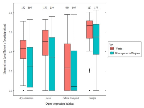 - Fried, G.; Petit, S.; Reboud, X. A specialist-generalist classification of the arable flora and its response to changes in agricultural practices. BMC Ecol. 2010, 10, 20. [Google Scholar] [CrossRef]