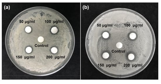 Inhibition zones of different concentrations (50 μg/mL, 100 μg/mL, 150 μg/mL, and 200 μg/mL) of Glycyrrhiza uralensis extract on agar plates of (a) Streptococcus mutans and (b) Candida albicans.