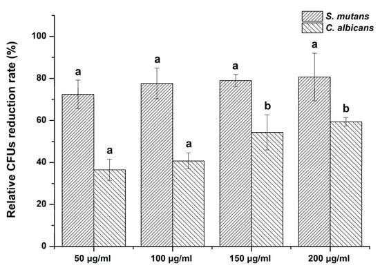 When the CFUs of the control were set at 100%, the CFU reduction rate for S. mutans did not differ significantly among the experimental groups (p > 0.05) (Figure 2). The CFU reduction rate for C. albicans increased with increasing concentrations of G. uralensis extract. There were no significant differences in the CFU reduction rates between 150 μg/mL vs. 200 μg/mL samples (p > 0.05) and between the 50 μg/mL vs. 100 μg/mL samples (p > 0.05). In all experimental groups, the CFU reduction rate was higher in S. mutans than in C. albicans.