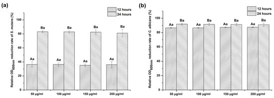 Relative optical density (OD600nm) value reduction rate of (a) Streptococcus mutans and (b) Candida albicans exposed to Glycyrrhiza uralensis extract with concentrations of 50, 100, 150, and 200 µg/mL at two different times. The same lowercase letters show no significant difference in relative OD600nm reduction rate between the experimental groups at each time point (p > 0.05). The different uppercase letters indicate significant differences in relative OD600nm reduction rate between 12 and 24 h for each experimental group (p < 0.05).