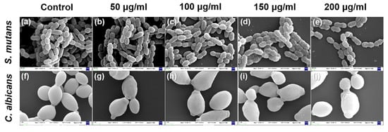 Field-emission scanning electron microscopy images of Streptococcus mutans and Candida albicans following (a,f) control and exposure to Glycyrrhiza uralensis extract with concentrations of (b,g) 50, (c,h) 100, (d,i) 150, and (e,j) 200 µg/mL. Upper 20,000×, lower 10,000×.