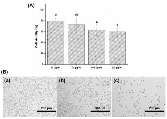 We found that the G. uralensis extract, in general, decreased cell viability (Figure 5A). The MTT assay showed that the viability of the L929 cells decreased as the concentration of G. uralensis extract increased in the following concentration (µg/mL) order: 50 > 100 > 150 > 200. The experimental solution with 50 µg/mL of G. uralensis extract yielded a survival rate of more than 70%, which was higher than that of the 150 and 200 µg/mL groups (p < 0.05). However, no significant difference was observed between the results for the experimental solutions with 50 and 100 µg/mL of the extract (p > 0.05).