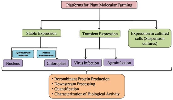 Recombinant proteins are complex exogenous (“foreign”) proteins that are produced in expression hosts, and mainly used as medical diagnostic reagents and in human healthcare as vaccines, drugs, or monoclonal antibodies []. The prominent role and increasing market demand for high-value recombinant proteins in novel drug discovery creates an opportunity for the development of various protein expression hosts to manufacture proteins by following the existing rigid standards laid down for veterinary and human applications. The industry is focusing mainly on already established production platforms using prokaryotic and eukaryotic expression host systems such as Escherichia coli, a selection of yeast, insect, and mammalian cell cultures, due to their well-defined processes in-line with current good manufacturing practice (cGMP) []. Moreover, industrially established mammalian and other cell cultures have stringent regulatory approval in place, which hinders the industrial acceptance of the new technology or production system. Bacterial expression systems offer rapid production with high product yield, whereas Saccharomyces cerevisiae and Pichia pastoris (yeast) offer post-translational modifications (PTMs) which are essential for functional activity of the recombinant proteins []. The majority of the approved recombinant biopharmaceuticals are produced in mammalian cell lines []. However, all the production systems have their own merits and setbacks such as production time, high operating costs, protein yield, chances of contamination with pathogenic microorganisms, limited post-translational modifications, and regulatory approval. In order to compete with the established platform, the new expression system must have unique advantages that can overcome the limitations of the existing ones. Plants offer several potential benefits over conventional expression platforms and prove the reliability of the system for the production of highly valuable proteins. Advancements in plant molecular farming approaches in the recent decade have made plants an attractive manufacturing system that can even achieve commercially relevant production levels in a short period [,,]. As the progress is continuously being made in this ever-growing field, here in this review, we summarize the importance and prospects of plant expression systems for the cost-effective production of recombinant proteins. Potential vaccine candidates, monoclonal antibodies, and industrial enzymes expressed in plants are also described.