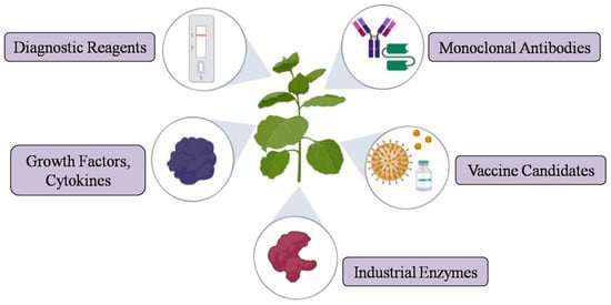 The Nicotiana genus is often used for genetic transformation studies due to its growth rate and easy genetic manipulation. Most of the recombinant proteins such as pharmaceuticals, vaccines, hormones, cytokines, growth regulators, and industrial products are produced in tobacco, which is considered as a molecular biology workhouse of the plant world. Nicotiana benthamiana and N. tabacum are two common species used for the stable and transient expression of recombinant proteins. Further, several cereal crops, fruits, and vegetables such as rice, maize, lettuce, tomato, potato, and alfalfa were also evaluated for their applicability in plant molecular farming (PMF) depending on the protein target and application []. Many plant-produced therapeutic proteins are in pre-clinical and clinical trials and are close to commercialization [,]. The strength and bottlenecks of the commercial potential of the plant expression system was critically reviewed and summarized by Schillberg et al. (2019) [].
