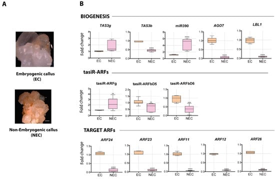 2.2. Differential Abundance of tasiR-ARF Pathway Components in EC and NEC Calli