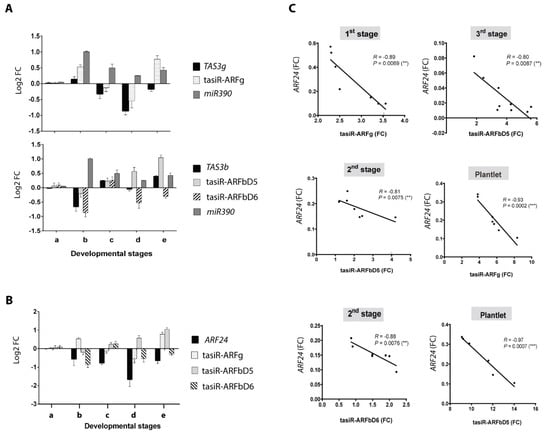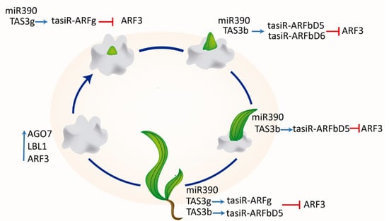 - Marin, E.; Jouannet, V.; Herz, A.; Lokerse, A.S.; Weijers, D.; Vaucheret, H.; Nussaume, L.; Crespi, M.D.; Maizel, A. miR390, Arabidopsis TAS3 tasiRNAs, and Their AUXIN RESPONSE FACTOR Targets Define an Autoregulatory Network Quantitatively Regulating Lateral Root Growth. Plant Cell 2010, 22, 1104–1117. [Google Scholar] [CrossRef] [PubMed]