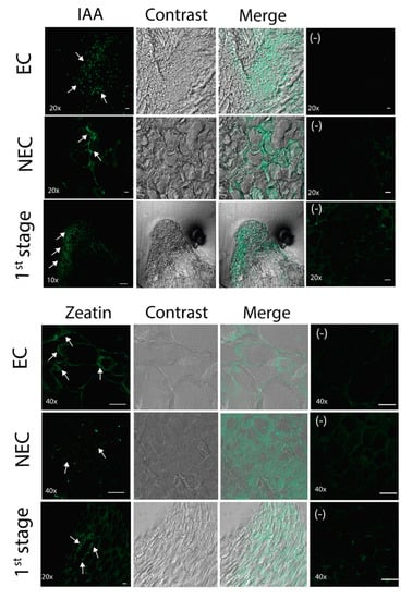 4.4. Auxin and Cytokinin Immunolocalization