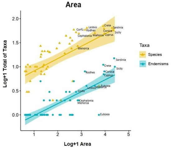 Multiple regression analysis was used to test if the area and elevation significantly predicted species and endemic richness in Mediterranean Basin. We enumerated the orchid flora of 52 islands in the Mediterranean biogeographic region according to Médail and Quézel [18] and Thompson [23]. species–area relationships (SARs), endemics–area relationships (EARs) [19,29,73] and species–elevation relationships were investigated using standard linear regression. For SARs and EARs, the log–log representation of the power model was applied [12,74]. Statistical analyses were performed using R Core Team 2015.