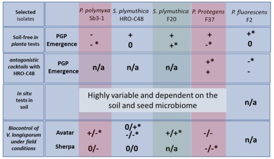 The use of a combination of strains, so-called microbial consortia, is recommended as a promising strategy for development of plant biostimulants and biological control solutions [,]. In order to select antagonistic consortia, we studied two opposing examples: P. fluorescens F2, which demonstrated a strong plant growth promotion effect in a soil-free system and P. protegens F37, which showed an effect on seedling’s germination that was significantly negative (Table 1). Each of these two strains was applied to the seeds of oilseed rape in combination with the most studied and commercially used strain S. plymuthica HRO-C48 [,,]. After two weeks of growth in sterile germination pouches, we compared changes in the biomass of seedlings that were treated with a combination of strains with the biomass of seedlings in control treatments, where strains were applied separately. We observed a greater than two-fold reduction in the plant growth promotion effect of the P. fluorescens F2 when it was applied in combination with HRO-C48 (Table 1). This reduction in the plant growth promotion effect was statistically significant. The positive effect of S. plymuthica HRO-C48 on the seedlings was insignificantly reduced, when this strain was applied in combination with F2. The strong reduction of the efficacy of the F2 when it was used in combination with HRO-C48 indicated that it would not perform well under natural conditions in which a large number of other microorganisms are present. This strain was therefore excluded from further trials. The combined treatment of P. protegens F37 with HRO-C48, on the other hand, resulted in a significant two-fold increase of the seedlings’ biomass compared to the singular application of F37 to the seeds. The plant growth promoting effect of HRO-C48 increased non-significantly due to the co-treatment with F37. This result allowed us to conclude that P. protegens F37 could be a good “team worker” alongside of other co-inoculants and potentially in combination with indigenous seed and plant microbiota, and thus it was included in the further selection strategy. In conclusion, we determined that the effect of single strain’s inoculation on the growth of plants is strongly dependent on other microorganisms present in the inoculum, whereby the effect of a single strain on the host plant may be enhanced either by increasing or decreasing plant biomass, depending on the co-inoculant. This kind of potentially either/or scenarios, in terms of synergistic versus deleterious effects on the members of antagonistic consortia applied to a variety of plant hosts have been observed on several occasions []. Based on the outcomes of this co-inoculation assay we selected following four strains for further investigations: S. plymuthica F20, P. protegens F37, S. plymuthica HRO-C48 and P. polymyxa Sb3-1.