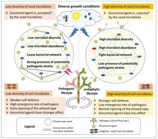 Because the microbial composition of plants is crucial for verticillium wilt outbreaks, and for efficient suppression of the disease, soil and plant microbial diversity are suggested as the keys to suppressing Verticillium outbreaks under field conditions. It was shown that the microbiome plays a crucial role in the suppression of verticillium wilt in other pathosystems []. Thus, we recommend re-thinking breeding and biocontrol strategies by integrating microbiome data in the development of new cultivars and biocontrol agents. We suggest that parameters, such as bacterial abundance and diversity within the seed, as well as the character of microbial networks and the presence of potentially pathogenic strains should be taken into account in the process of developing of new cultivars. The greater the diversity of the indigenous bacterial microbiome of the seed, the stronger its resistance to pathogens, and the lesser the need for further interventions will be. Further, we recommend including host seed microbiome analysis in early stages of biocontrol agents’ development. This may help in selecting a suitable biological treatment which is compatible with the indigenous seed microbiome. Such a treatment should enhance overall microbial diversity of the seed by adding the “missing” microbes to the existing microbiota (Figure 2).