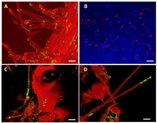 We published stunning images of the rape seed´s microbiome and of biocontrol agents colonizing seeds and various tissues of oilseed rape in our previous studies [,]. In order to gain deeper insight into how our selected biocontrol agents interact with V. longisporum and with the host plant, we visualized a three-way interaction using CLSM. For this test S. plymuthica HRO-C48 was chosen as a representative of a successful biocontrol agent against V. longisporum in oilseed rape. Cells of gfp-labelled S. plymuthica HRO-C48 were applied to the seeds of oilseed rape (cultivar Traviata) and the seedlings were grown for 28 days under gnotobiotic soil-free conditions. In order to study the three-way interaction, the seedlings were additionally infested with V. longisporum ELV25, while the control plants were left without the pathogen. We found that HRO-C48 colonized both the phyllosphere and the rhizosphere of the oilseed rape in large amounts in the absence of V. longisporum. Bacterial cells were found in large clusters surrounding plant cells (Figure 3A,B). In the Verticillium-infested plants, on the other hand, we found large numbers of bacterial cells directly associated with the fungal hyphae, in addition to bacterial clusters associated with the plant tissues (Figure 3C,D). When used in the interpretation of bacterial-fungal interaction the CLSM technique does not allow the viewer to clearly distinguish between synergistic or antagonistic interactions. The ability of HRO-C48 to produce antifungal substances such as pyrrolnitrin or chitinases [,] allows us to speculate that the images we observe in Figure 3B,D illustrate how the potential biocontrol agent S. plymuthica HRO-C48 may inhibit the growth of fungal pathogens.