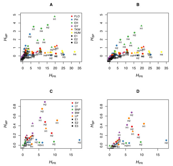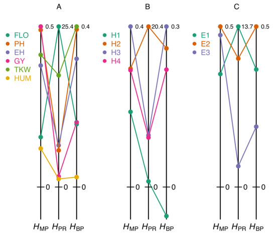 We illustrate this by using experimental data from maize. We measured six traits (flowering time, plant height, ear height, grain yield, thousand-kernel weight, and kernel moisture) in four crosses (B73 × F252, F2 × EP1, F252 × EP1, F2 × F252) grown in three different environments in France (Saint-Martin-de-Hinx in 2014, Jargeau in 2015, and Rhodon in 2015). We computed , and for the 72 trait-cross-environment combinations. Figure 1A,B shows that the relationship between and the other two coefficients is very loose, if any. A given value can correspond to a wide range of or values, and vice versa. We performed the same analyses using the data published by Shang et al. [10], who measured five traits in two crosses of cotton grown in three environments. The same loose relationship between and either heterosis coefficient was observed (Figure 1C,D). This means that the normalized differences between the parents, which are not related to heterosis, since they do not include values from the hybrids, markedly affect and .