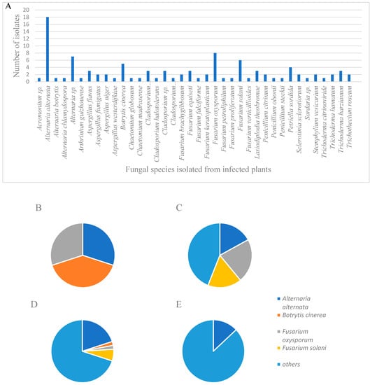 (A) Fungal species that were isolated from infected plant material from commercial farms throughout Israel. The four most frequent fungi that were isolated included Alternaria alternata, Botrytis cinerea, Fusarium oxysporum, and F. solani. (B–E) Pie charts of isolated fungi, with emphasis on the four most common fungi that were isolated (Alternaria alternata, Botrytis cinerea, Fusarium oxysporum, F. solani and others) during different seasons: (B) spring (March–May), (C) summer (June–August), (D) autumn (September–November) and (E) winter (December–February).