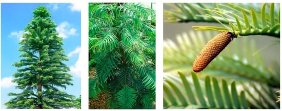 - Setoguvhi, H.; Osawa, T.A.; Pintaud, J.; Jaffré, T.; Veillon, J.-M. Phylogenetic relationships within Araucariaceae based on RBCL gene sequences. Am. J. Bot. 1998, 85, 1507–1516. [Google Scholar] [CrossRef]