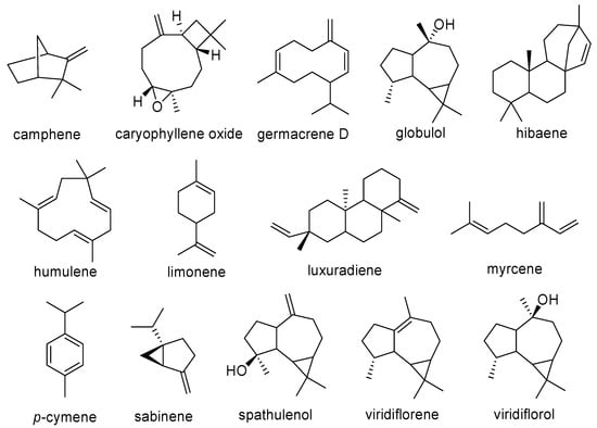 - Briggs, L.H.; White, G.W. Constituents of the essential oil of Araucaria araucana. Tetrahedron 1975, 31, 1311–1314. [Google Scholar] [CrossRef]