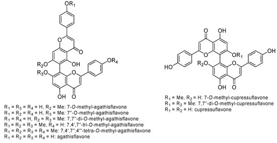 - Khan, N.U.; Ilyas, M.; Rahman, W.; Mashima, T.; Okigawa, M.; Kawano, N. Biflavones from the leaves of Araucaria bidwillii Hooker and Agathis alba foxworthy (Araucariaceae). Tetrahedron 1972, 28, 5689–5695. [Google Scholar] [CrossRef]