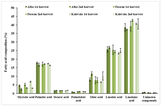Concerning the harvest time, Alba and Kalevalas’ JAPC exhibited higher oleic acid contents in the second harvest (when the nights were cooler). According to Barrero-Sicilia et al. [44], plants often respond to low temperature by increasing the levels of unsaturated fatty acids in the membrane and increasing membrane fluidity and stabilization. We found the opposing tendency in the saturated myristic acid (C14:0) contents of the JAPC, in which levels were higher in the first harvest (when the nights were warmer).