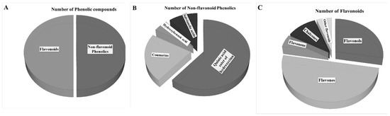 Identified phenolic compounds from Jerusalem artichoke leaf protein concentrate: (A) ratio of flavonoid and non-flavonoid phenolic compounds; (B) number of identified compounds within non-flavonoid phenolics subgroup; and (C) number of identified compounds within flavonoid phenolics subgroup.