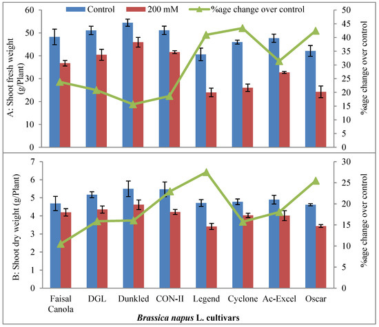 Shoot fresh (A) and dry weights (B) (g/plant) of eight cultivars of canola (Brassica napus L.) when two weeks old plants were grown under control (0 mM NaCl) or saline (200 mM NaCl) conditions for further five weeks (n = 3); Error bars are representing standard error.