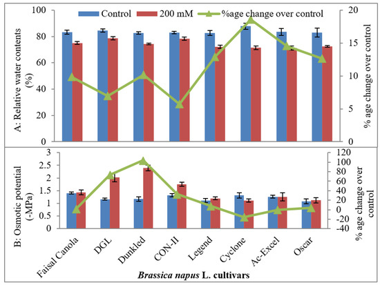 Relative water contents (A) (%) and osmotic potential (B) (−MPa) of eight cultivars of canola (Brassica napus L.) when two weeks old plants were grown under control (0 mM NaCl) or saline (200 mM NaCl) conditions for further five weeks (n = 3): Error bars are representing standard error.