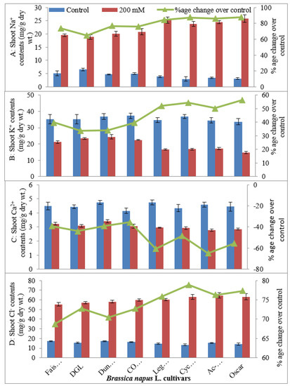 Shoot Na+ (A), K+ (B), Ca2+ (C), and Cl− (D) contents (mg/g dry wt.) of eight cultivars of canola (Brassica napus L.) when two weeks old plants were grown under control (0 mM NaCl) or saline (200 mM NaCl) conditions for further five weeks (n = 3); Error bars are representing standard error.