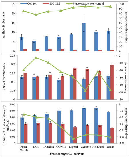 Shoot K+/Na+ ratio (A), Ca2+/Na+ ratio (B), and nutrient utilization efficiency (C) (mg2/µg) of eight cultivars of canola (Brassica napus L.) when two weeks old plants were grown under control (0 mM NaCl) or saline (200 mM NaCl) conditions for further five weeks (n = 3); Error bars are representing standard error.