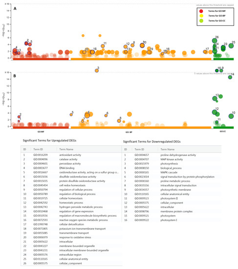 For upregulated DEGs, significant GO terms of the “Molecular Function” category included antioxidant activity (GO:0016209), DNA binding (GO:0003677), and peroxidase activity (GO:0004601). Significant GO terms of the “Biological Process” category included regulation of cellular process (GO:0050794), regulation of biological process (GO:0050789), homeostatic process (GO:0042592), hydrogen peroxide metabolic process (GO:0042743), cellular detoxification (GO:1990748), regulation of gene expression (GO:0010468), response to oxidative stress (GO:0006979), transmembrane transport (GO:0055085), and potassium ion transmembrane transport (GO:0071805). Significant GO terms of the “Cellular Component” category included intracellular membrane-bounded organelle (GO:0043231), cellular anatomical entity (GO:0110165), and cellular component (GO:0005575) (Table 2). For downregulated DEGs, significant GO terms of the molecular function category included MAP kinase activity (GO:0004707) and proline dehydrogenase activity (GO:0004657). Significant GO terms of the “Biological Process” category included MAPK cascade (GO:0000165), intracellular signal transduction (GO:0035556), and proline metabolic process (GO:0006560). Significant GO terms of the cellular component category included photosynthetic membrane (GO:0034357) and membrane protein complex (GO:0098796) (Figure 5).