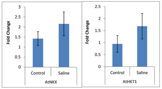 The expression of two genes, i.e., AtNKX and AtHKT1, was assessed using RT-PCR. These genes were selected on the basis of having a documented role in salt tolerance mechanism [7,14,34]. RNA was converted to cDNA using Vivantis cDSK01-050 cDNA synthesis kit (Vivantis Technologies, 40170 Shah Alam, Selangor Darul Ehsan, Malaysia). Real-time polymerase chain reactions were performed on Mic PCR (Bio Molecular Systems, Brisbane Queensland, Australia). Beta-ACTIN was used as an internal control. Primer sequences are given in Table S5.