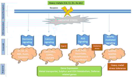 - Kumar, S.; Trivedi, P.K. Heavy Metal Stress Signalling in Plants. Plant Metal Interaction (Emerging Remediation Techniques); Elsevier: Amsterdam, The Netherlands, 2016; pp. 585–603. [Google Scholar]