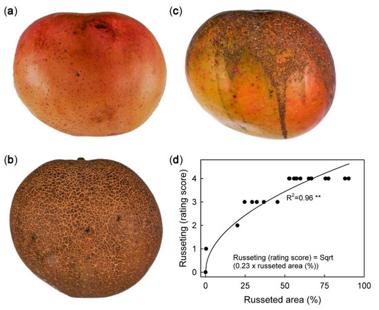 Macroscope view of mature ‘Apple’ mango without (a, score 0), moderate (b, score 2), and extreme (c, score 4) russet symptoms. (d): Plot of russeting (rating score) against percentage area affected by russet (image analysis). Each fruit was rated visually prior to image analysis. The number of observations was 18.
