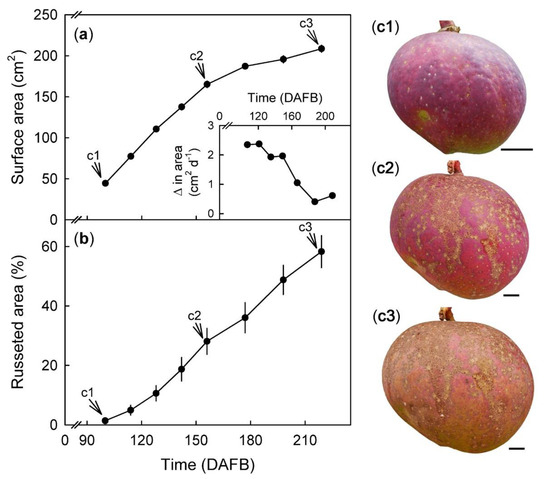 Fruit surface area increased with time (Figure 2a). The growth rate in surface area was at a maximum of 2.3 cm2 day−1 at about 114 days after full bloom (DAFB) and decreased continuously thereafter (Figure 2a inset). The percentage of the surface area of the skin exhibiting russet increased with time throughout development (Figure 2b,c).