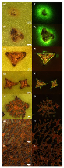 Microscopic view of ‘Apple’ mango skin infiltrated with acridine orange dye when viewed with a binocular microscope under natural (a,c,e,g,i,k,m) or fluorescent light (b,d,f,h,j,l,n). The scale bars refer to the corresponding pairs of images.