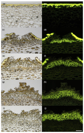Cross-sectional microscope images of a non-russeted (a,b) and russeted (c–j) skin of ‘Apple’ mango viewed under incident white (a,c,e,g,i) or fluorescent light (b,d,f,h,j) following staining with fluorol yellow dye. Scale bar is 50 µm.