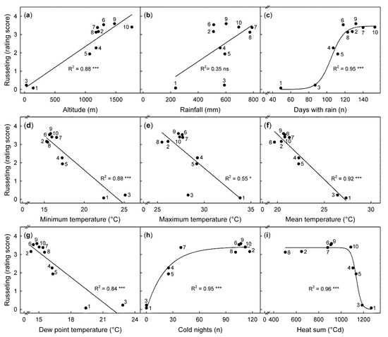 Relationship between climatic variables and average russeting (rating score) determined for the cumulative period of fruit maturity at ten locations in Kenya. The ten locations were: Garissa (1), Chepsigot (2), Malindi (3), Mumbuni (4), Yeemulwa (5), Kaiti (6), Kasafari (7), Kambirwa (8), Thika (9), and Machakos (10) situated at different altitudes. (a) The climatic variables include: rainfall amount (b), days with rainfall (c), relative humidity (d), minimum, maximum, and mean daily temperatures (e, f, and g, respectively). Cold nights (h) correspond to the number of days when the minimum temperature fell below the base temperature of 16 °C. Heat sum (i) was calculated based on a base temperature of 16 °C. Russeting was quantified using a five-score rating scheme: score 0: 0% of the fruit surface area russeted; score 1: 1–10% russeted area; score 2: 11–25% russeted area; score 3: 26–50% russeted area; and score 4: 51–100% russeted area. Data points represent means of 210 fruit per site.