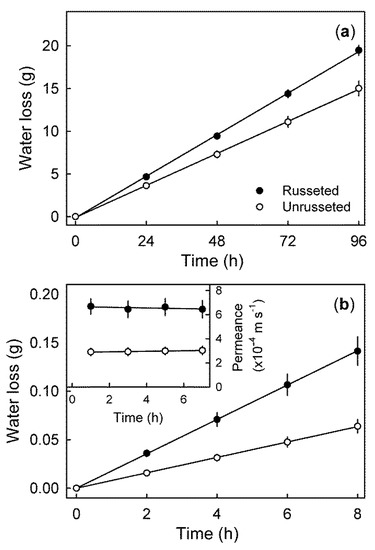 Transpiration increased linearly with time. Russeted fruit had significantly higher rates of transpiration compared to non-russeted fruits (Figure 6a). The epidermal sections (ES) from russeted skin also exhibited higher transpiration compared to non-russeted ES (Figure 6b). Permeance to water loss was constant with time but higher in russeted ES compared to control (Figure 6b inset).