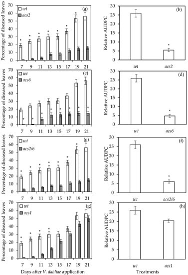 Twenty-day-old plants were root-drenched either with 10 mL of 107 V. dahliae conidia mL−1 sterile distilled water per plant or sterile distilled water (mocks) []. The experiment was repeated three times with 10 plants per genotype (wt, acs2, acs2, acs2/6, acs1) and treatment (V. dahliae; mocks) per replication (a total of 30 plants treated with V. dahliae and 30 mock inoculated plants per genotype). The monitoring of Verticillium wilt symptoms started at 7 dpi until 21 dpi. Disease severity at each observation was calculated from the number of leaves that showed Verticillium symptoms as a percentage of the total number of leaves of each plant. Subsequently, the area under the disease progress curve (AUDPC) was calculated by the trapezoidal integration method [] for each plant. Disease was expressed as a percentage of the maximum possible area for the whole period of the experiment, which is referred to as the relative AUDPC [].