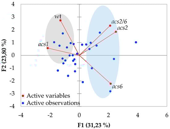 On the other hand, the acs1 plants were not resistant to V. dahliae even if they had less Verticillium wilt symptoms than wt until 13 dpi (Figure 1g,h). The mean relative AUDPC value of the acs1 plants was similar to wt as a result of the enhanced disease severity recorded in the acs1 after 15 dpi. The principal component analysis revealed that acs1 was clustered with wt in the axis describing the 31.2% of the variation.