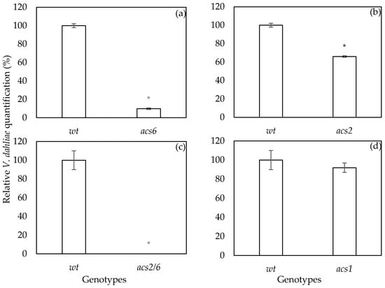 Relative quantification of the V. dahliae DNA levels in the Arabidopsis mutants acs6 (a), acs2 (b), acs2/6 (c), acs1 (d), and wild type Col-0 plants. Fungal DNA levels were estimated by qPCR using total DNA isolated from the aerial parts of plants at 21 days post-inoculation. The columns represent the means of 3 biological repeats (with 10 plants per genotype and repeat) and 3 technical repeats per biological repeat (total of nine reactions per treatment). The vertical bars indicate the standard errors. Wild type is set to 100%. Columns with asterisks (*) are significantly different (p < 0.05) from wt according to a t-test.