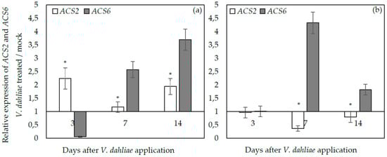 To examine whether ACS2 and ACS6 are differentially expressed upon V. dahliae infection, qPCR analysis was performed on cDNAs prepared from root and above ground (leaves and stems) tissues of Arabidopsis plants (wt) sampled at 3, 7, and 14 dpi. In the above ground tissues, ACS6 was initially downregulated (3 dpi), while ACS2 was upregulated two-fold compared to mocks (Figure 4a). The expression levels of ACS6 increased with time, being 2.5 and 3.7 times higher than mocks, at 7 and 14 dpi, respectively. On the other hand, the expression of ACS2 decreased at 7 dpi and increased at 14 dpi, 1.9-fold more than mocks.