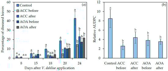 Disease severity (a) and relative AUDPC (b) of Arabidopsis thaliana wild type plants, root-drenched with ACC and AOA before and after inoculation with Verticillium dahliae. Vertical bars indicate the standard errors based on twelve replicates. All values were subjected to analysis of variance. At each day in (a) and between treatments in (b) different letters above columns denote statistically significant differences according to LSD multiple range test at p < 0.05.
